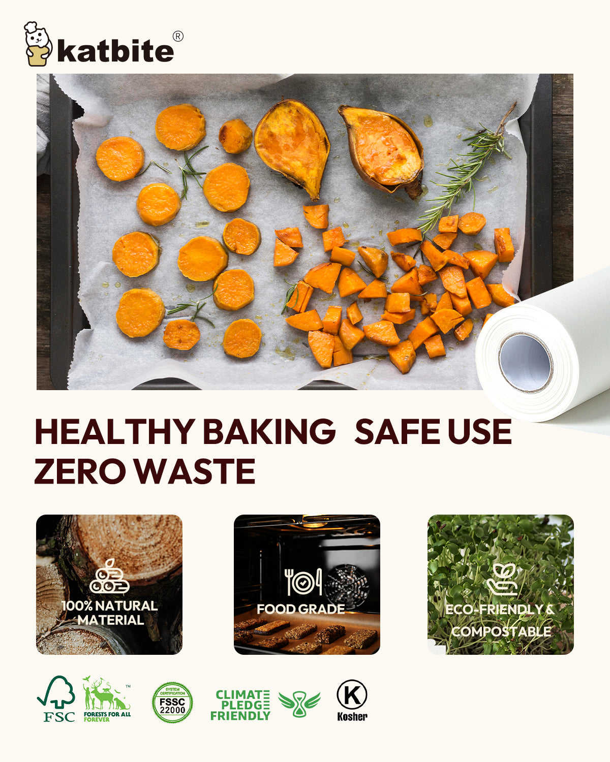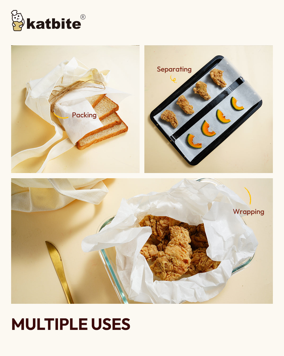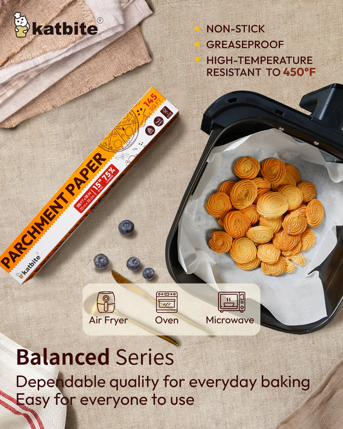 Katbite white baking parchment paper roll is designed for everyday baking and cooking, featuring a smooth non-stick surface enhanced by a 3× food-grade silicone oil coating. This triple-layer coating helps food release easily without tearing or sticking, while improving oil resistance for cleaner results. Made from 40gsm food-safe parchment paper, it delivers reliable performance at a great value for daily home use.