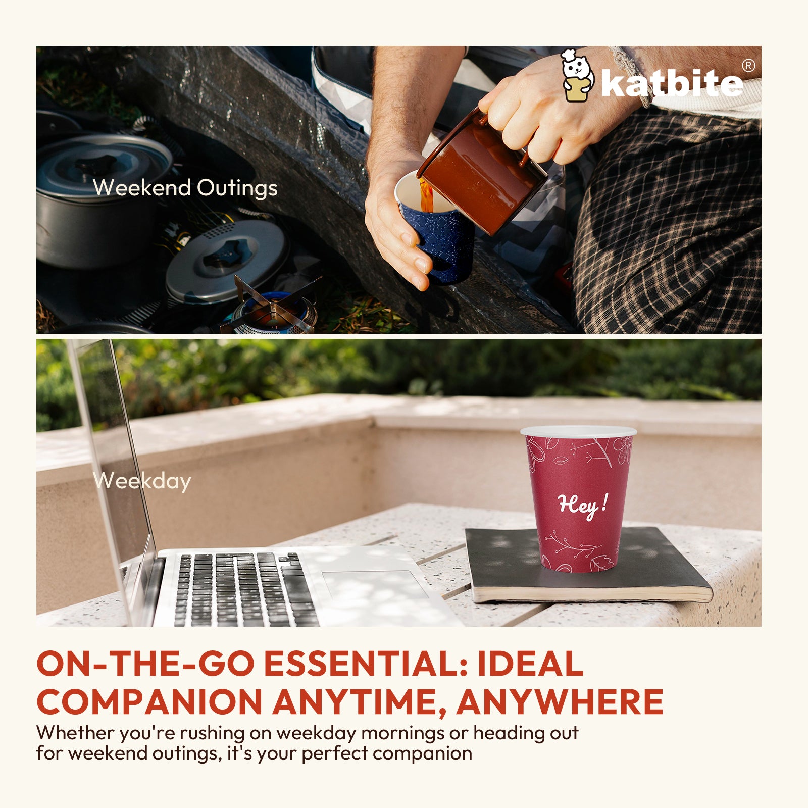 Eco friendly disposable paper cups made from wood pulp paper with a PE coated interior for soak proof, leak resistant performance. Reinforced rolled rim keeps the cup sturdy and comfortable to sip. Works for hot coffee, tea, water, juice and party drinks. Stackable design stores easily for picnics, barbecues, events and everyday use.
