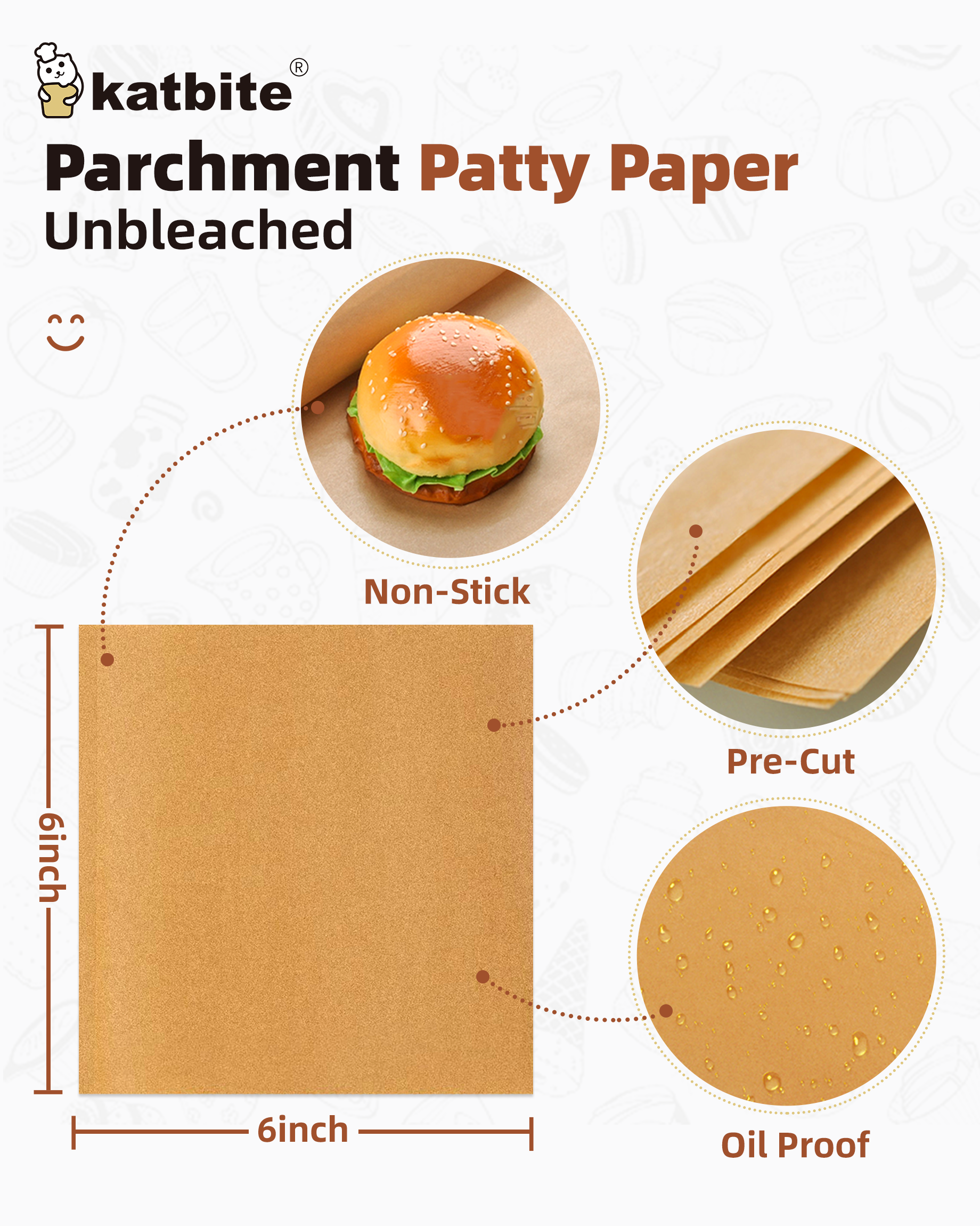 Katbite unbleached patty paper squares are made with a heavy-duty parchment paper construction, designed specifically for burger preparation and storage. Each sheet features a 3× thicker food-grade silicone coating, providing reliable non-stick release and enhanced moisture resistance.