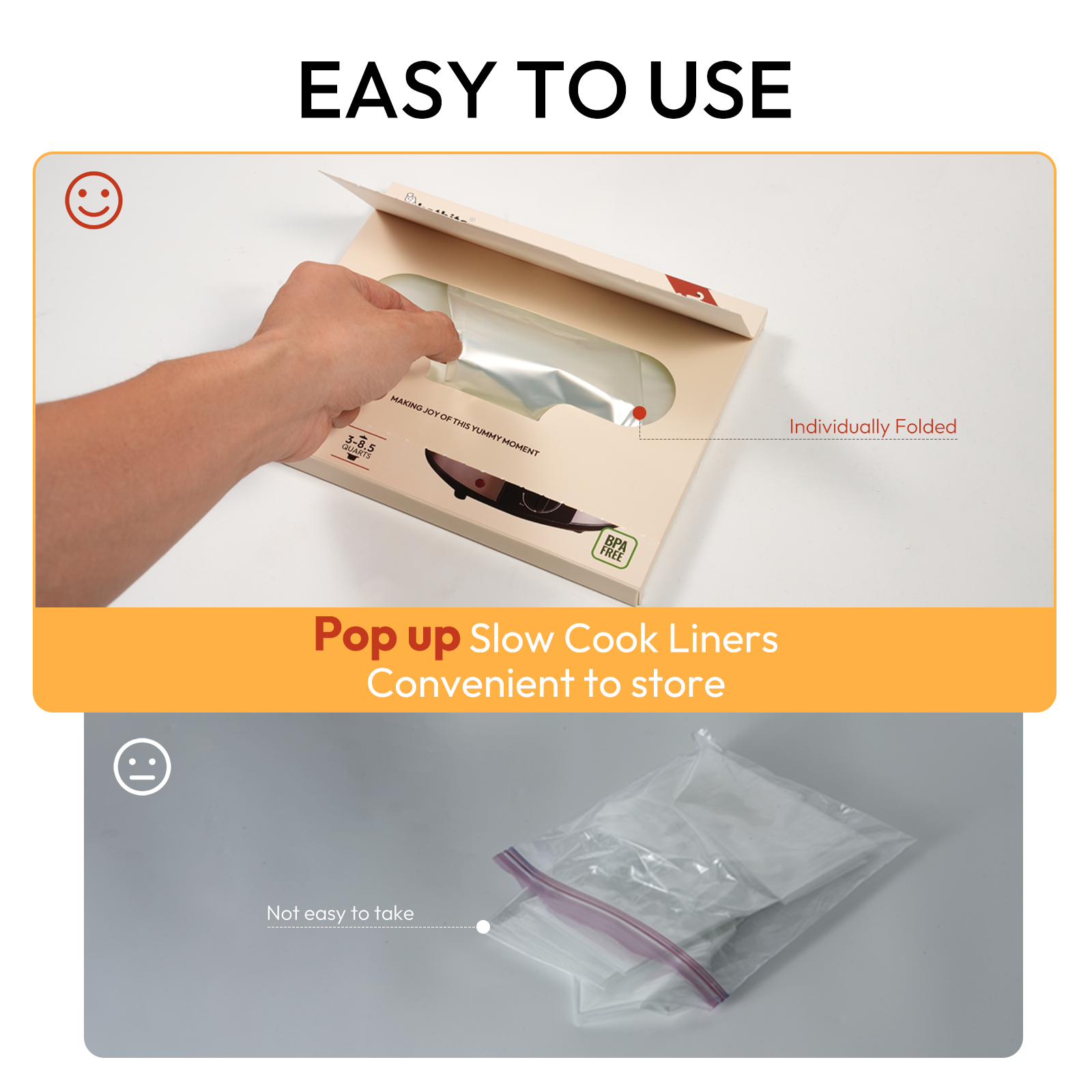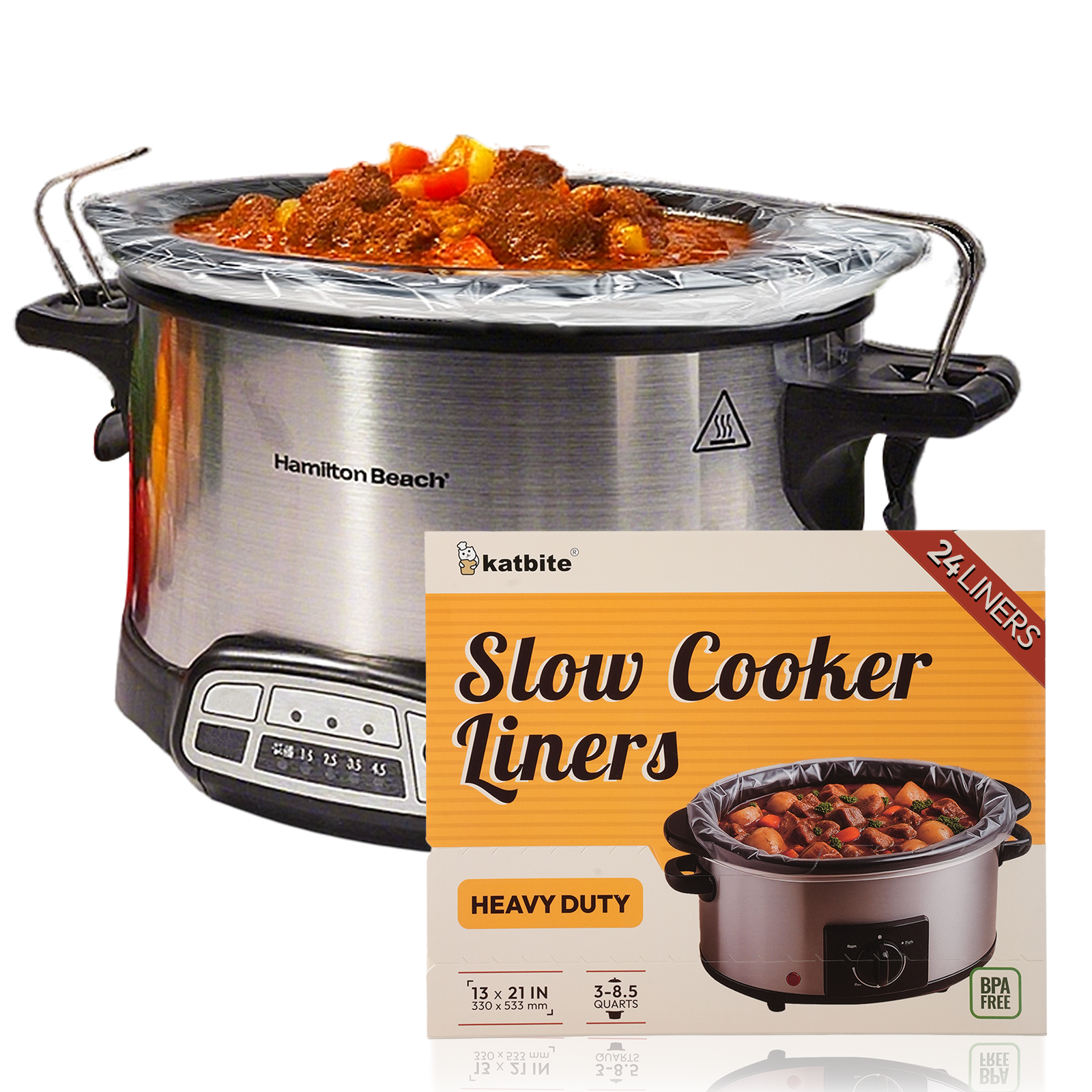 Cook more and clean less. Katbite slow cooker liners use a thick nylon blend that resists punctures and leaks to help contain juices and reduce flavor transfer between recipes. BPA free and food contact safe, they handle slow cooking heat up to 392F when used as directed. Line the pot, add ingredients, then lift and toss for mess free cleanup. Not for stovetop, broiler, or direct flame.